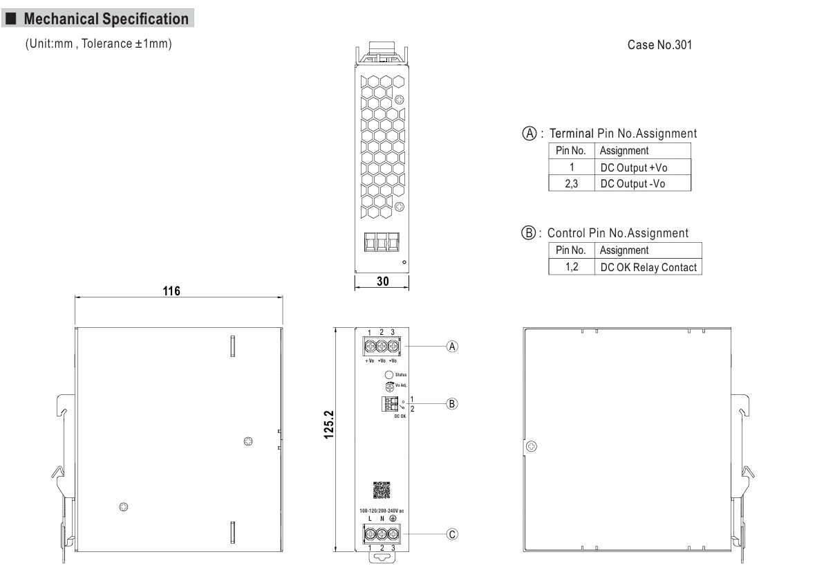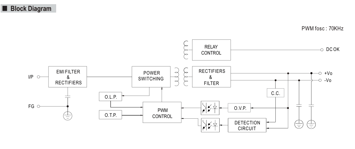 یکی از ویژگیهای مهم این مدل، سیگنال DC OK است که بهصورت کنتاکت رلهای (30VDC/1A یا 30VAC/0.5A) در دسترس قرار دارد.