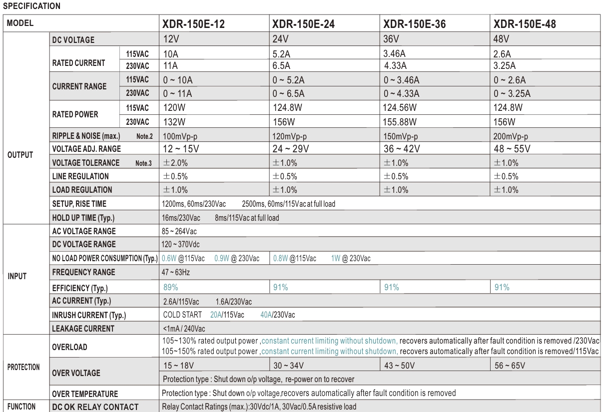 ویژگیهای منبع تغذیه ریلی XDR-150E-12