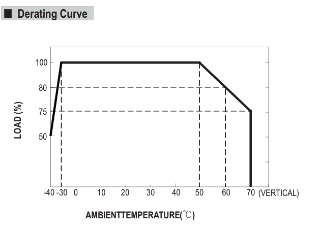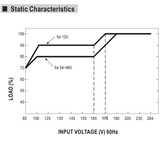 در ورودی 115VAC: در بازه 105 تا 150 درصد توان نامی، منبع تغذیه وارد حالت محدودسازی جریان ثابت (Constant Current Limiting) میشود و بدون خاموشی، خروجی را پایدار نگه میدارد. پس از برطرف شدن اضافه بار، دستگاه بهصورت خودکار به شرایط عادی بازمیگردد.