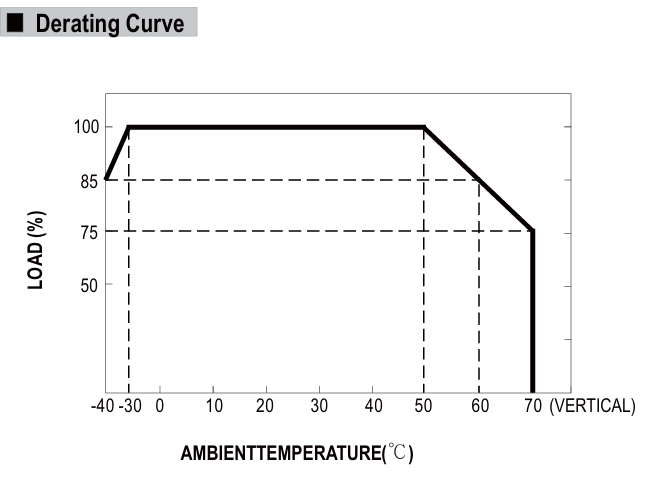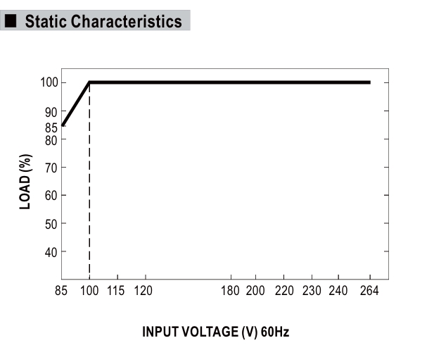 در ورودی 230VAC: در بازه 105 تا 130 درصد توان نامی، منبع تغذیه وارد حالت محدودسازی جریان ثابت (Constant Current Limiting) میشود و پس از رفع اضافه بار، بهطور خودکار بازیابی میگردد.