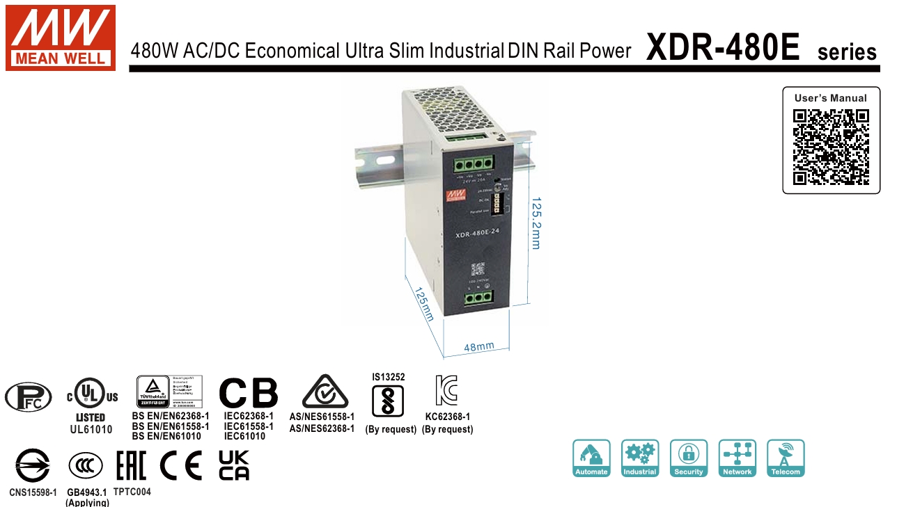 بهعنوان عضوی از خانوادهی جدید XDR-E Series، این مدل نسبت به نسلهای پیشین مانند SDR، NDR و EDR راندمان بالاتر، ابعاد کوچکتر و مصرف انرژی پایینتری دارد؛ بنابراین گزینهای ایدهآل برای اتوماسیون صنعتی، تجهیزات کنترلی، سیستمهای برق اضطراری و شبکه محسوب میشود.