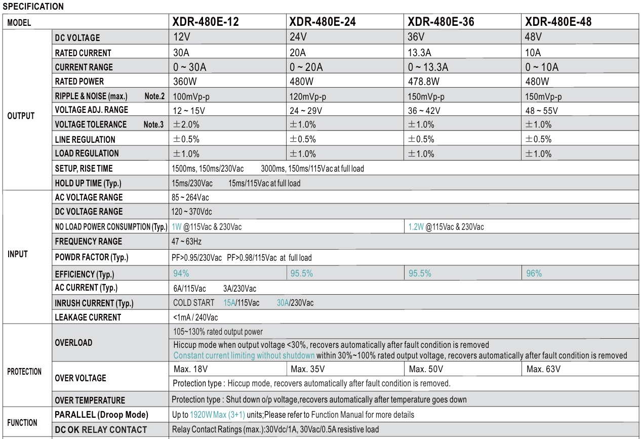 در این بخش به توضیحات مختصر ویژگیهای منبع تغذیه XDR-480E-36 از برند مینول (MEAN WELL) میپردازیم.