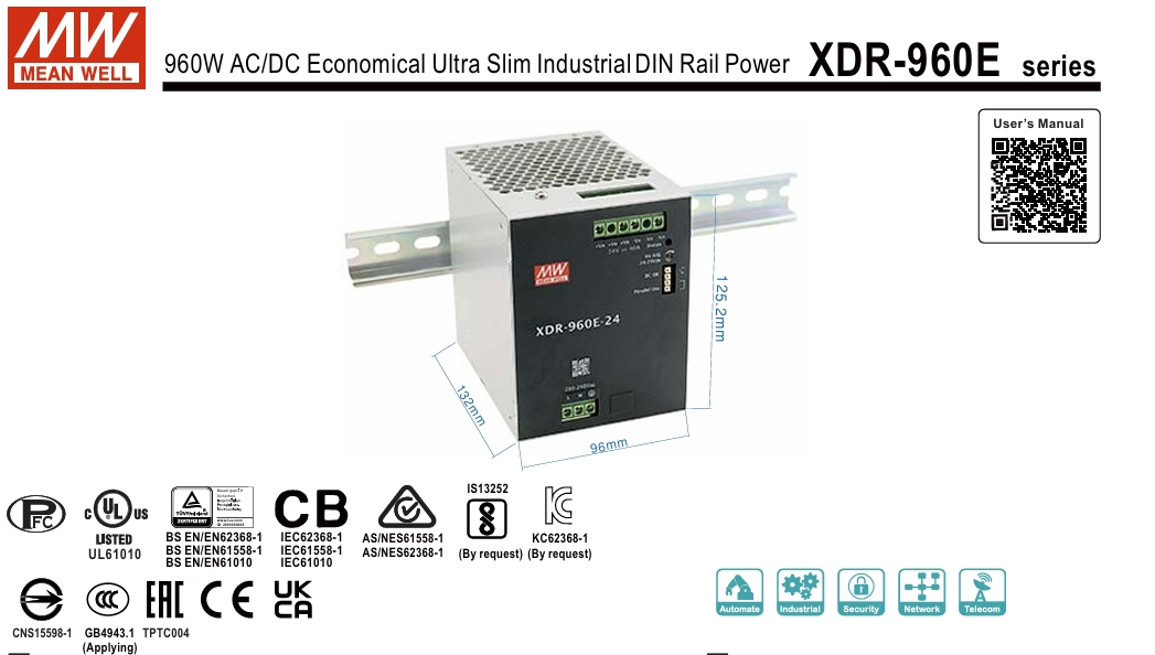 منبع تغذیه XDR-960E-24 از برند مین‌ول (MEAN WELL)، یک پاور سوئیچینگ ریلی باریک (Slim DIN Rail) و اقتصادی با توان 960 وات و خروجی 24 ولت DC (قابل تنظیم در بازه 24 تا 29 ولت) – جریان نامی 40 آمپر است.