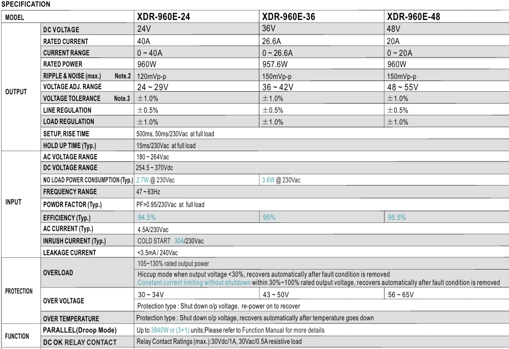 در این بخش به توضیحات مختصر ویژگی‌های منبع تغذیه XDR-960E-24 از برند مین‌ول (MEAN WELL) می‌پردازیم.