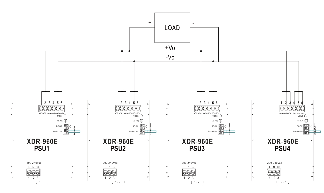 در حالت موازی، ماژول‌ها جریان خروجی را به‌صورت هوشمند بین خود تقسیم می‌کنند (Current Sharing) تا بار به شکل یکنواخت توزیع شود و از اضافه‌بار شدن یک واحد جلوگیری گردد.